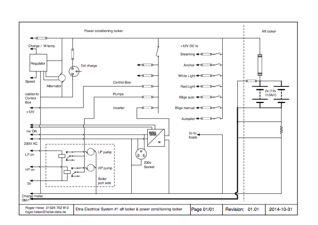 System #1 provides main-switched and fused 12V DC to propulsion loads (inverter, boiler pumps and control box); and individually switched and fused ancilliary loads (lights, bilge pump).